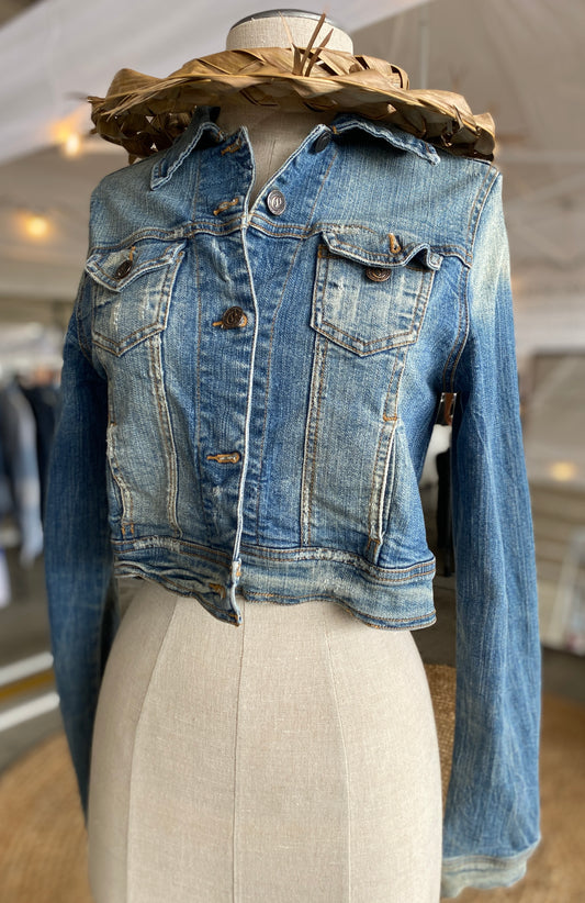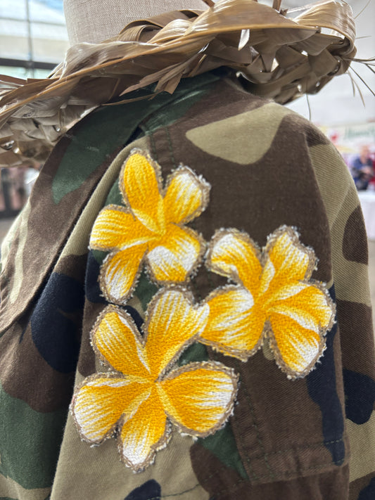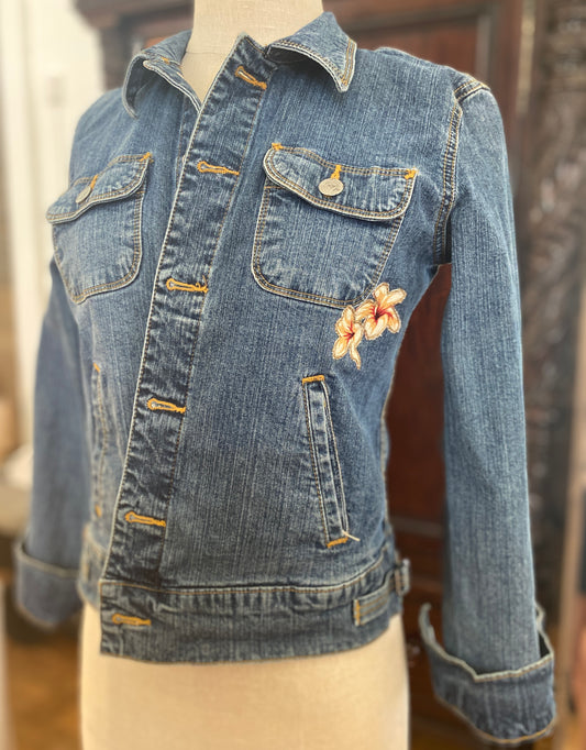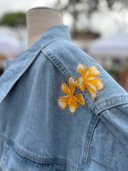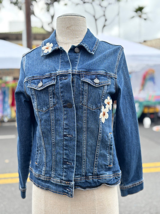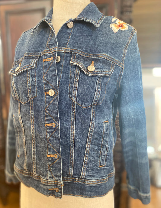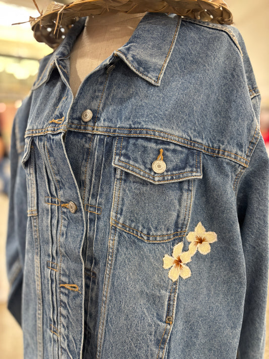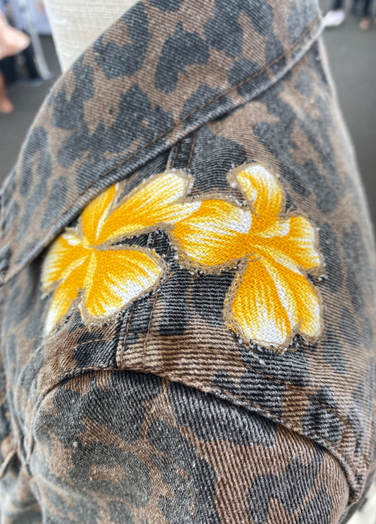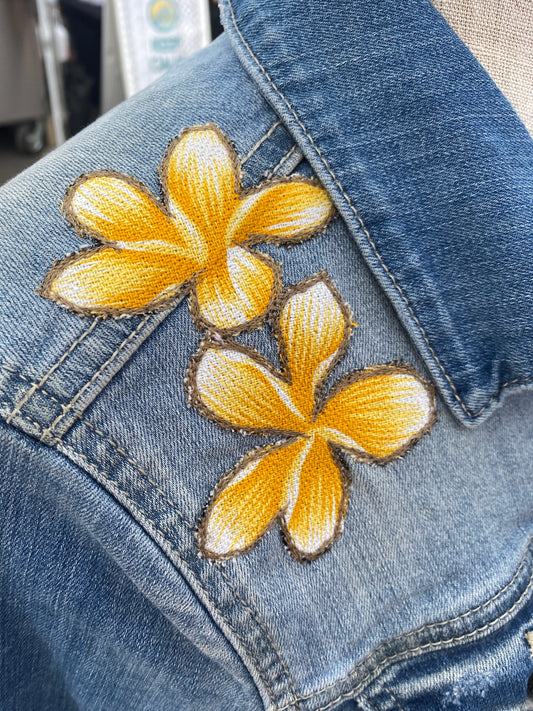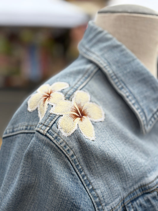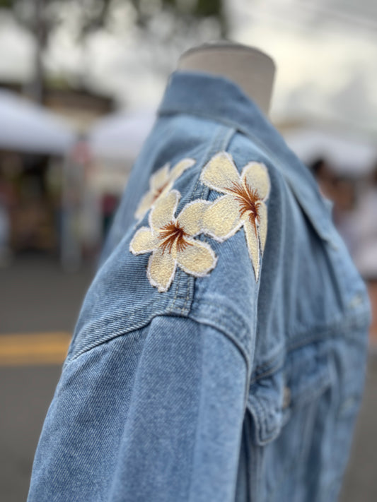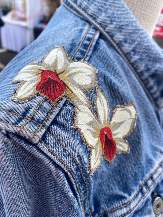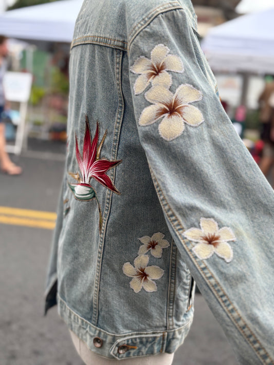 Vintage Tropical Appliqué On Upcycled Jean Jackets Manually Sewn Straight Stich Embroidery Handmade...